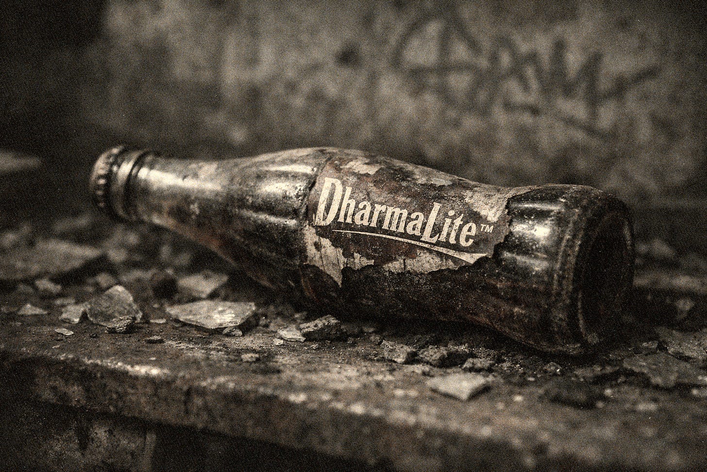 Historians like David McMahan call this “Buddhist Modernism” — a specific, hybrid creature born from the collision of Asian reform movements and Western existential anxiety, each side wanting something the other had.5 The Asians wanted legitimacy in a colonial world that equated rationality with civilisation. The Westerners wanted transcendence without the metaphysical overhead. Both sides made the deal. Both sides shook hands across the table. The resulting product was clean, scalable, and thoroughly rationalised. Buddhist scholar Alexander Berzin called it Dharma Lite: a stripped down version of Buddhism where we keep all the mindfulness, add a drop of meditation, but trim off all the cosmology, rebirth, and karma, to create a bespoke product tailored for the modern subject.6 A product that morphed in the blink of an eye into a monthly digital subscription with an optional premium tier.